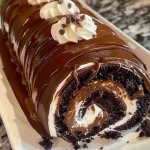Prepare the ganache: For the topping, heat the heavy cream in a microwave-safe bowl until it begins to simmer. Pour the hot cream over the chocolate chips and stir until smooth. Allow the ganache to cool slightly, then pour it over the cake roll, letting it drip down the sides.