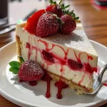 Serve: Before serving, generously top your cheesecake with the macerated strawberries, allowing the juices to drip down the sides. The vibrant red from the strawberries beautifully contrasts with the creamy cheesecake and graham cracker crust.
