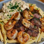 Cajun Shrimp and Steak Alfredo Pasta is a sensational dish that brings together the robust flavors of Cajun seasoning, succulent shrimp, and tender steak, all enveloped in a creamy Alfredo sauce. This dish is not just a meal; it’s an experience for your taste buds! Imagine twirling perfectly cooked penne pasta around your fork, coated in a rich, velvety sauce, complemented by the spices that transport you straight to the heart of Louisiana. This recipe is worth making not only because it’s delicious but also because it combines effortless preparation with irresistible flavors, making it perfect for family dinners or date nights.